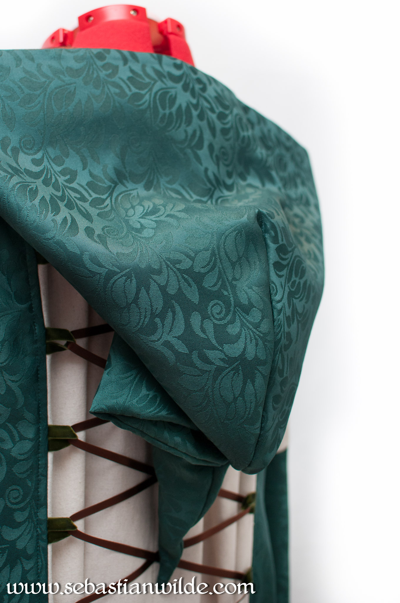 The main body of the dress is made from a rich, leaf patterned woven damask in deep, foresty green. The contrasting centre front & back panels feature a row of 6 lacing loops, made of soft velvet ribbon. The lacing on the front starts at the bust line and extends to about hip level, while the lacing on the back starts slightly higher up allowing you to adjust the fit across the shoulders and back. Lacing ribbon is thin (6mm) satin ribbon in a slightly coppery brown colour, to match the inside of the sleeves and hood. The extra fabric will fold & gather to hang down into the full hem as you tighten the lacing.