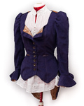 Small pleats radiate upward from the centre back waist, providing a fitted silhouette while allowing for some movement across the shoulders. An ornamental “epaulette” with swirly metallic stitching is fastened across the back waist seam with two metal dome buttons. The tail splits down the centre back about half way between the waist and hips.